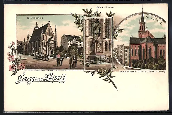 Lithographie Leipzig, Thomaskirche, Leibnitz-Denkmal, Kathol. Kirche