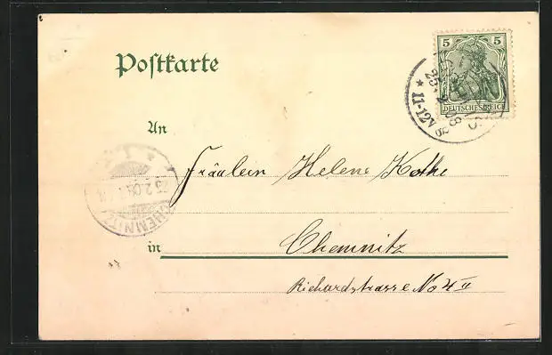 gelaufen 1908, Eckknick li. oben, Stempelspur, guter Zustand