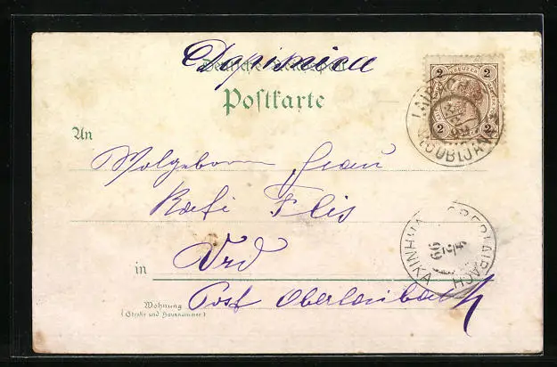 Personenbezogene Daten auf der Rückseite der Karte wurden durch blauen Textmarker unkenntlich gemacht. Die blauen Stellen sind auf die Vorderseite durchgeweicht und wirken sich negativ auf das Postkartenfoto aus