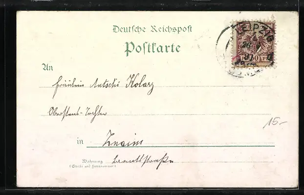 Personenbezogene Daten auf der Rückseite der Karte wurden durch blauen Textmarker unkenntlich gemacht. Die blauen Stellen sind auf die Vorderseite durchgeweicht und wirken sich negativ auf das Postkartenfoto aus