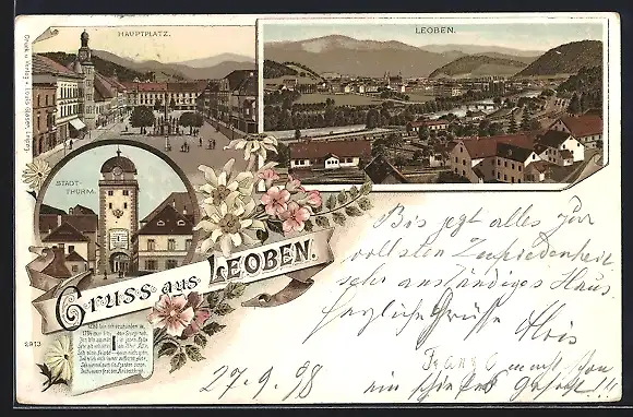 Lithographie Leoben, Hauptplatz mit Denkmal, Stadtthurm, Ortsansicht