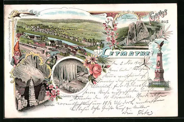 Lithographie Letmathe, Kriegerdenkmal, Dechenhöhle, Ortsansicht