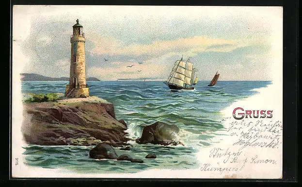Lithographie Leuchtturm am Wasser erhellt Segelschiff den Weg