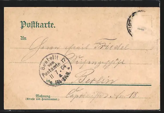 gelaufen 1904, Briefmarke entfernt, rückseitig Oberflächenschaden, Bugspur li. oben, guter Zustand