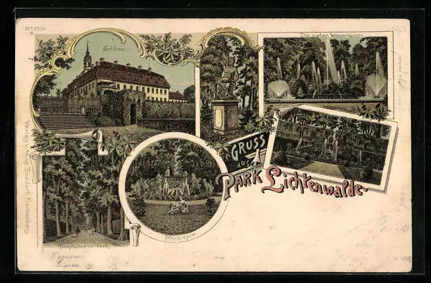 Lithographie Lichtenwalde, Schloss, Freitreppe, Die sieben Wasserkünste