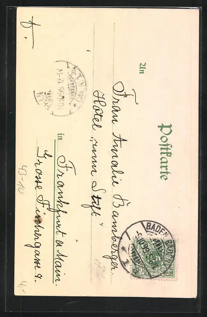 Personenbezogene Daten auf der Rückseite der Karte wurden durch blauen Textmarker unkenntlich gemacht. Die blauen Stellen sind auf die Vorderseite durchgeweicht und wirken sich negativ auf das Postkartenfoto aus
