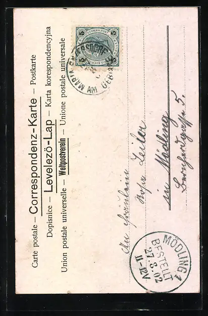 Personenbezogene Daten auf der Rückseite der Karte wurden durch blauen Textmarker unkenntlich gemacht. Die blauen Stellen sind auf die Vorderseite durchgeweicht und wirken sich negativ auf das Postkartenfoto aus
