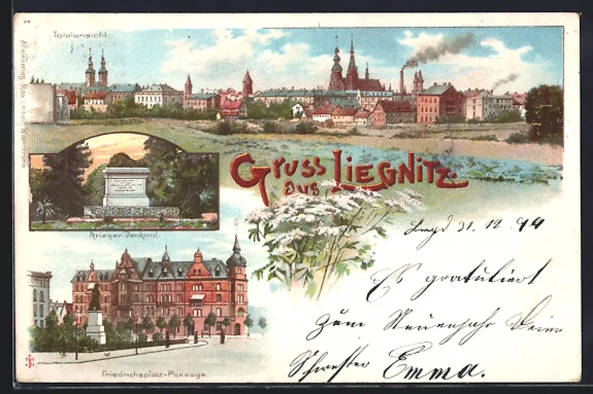 Lithographie Liegnitz, Totalansicht, Krieger-Denkmal, Friedrichsplatz-Passage