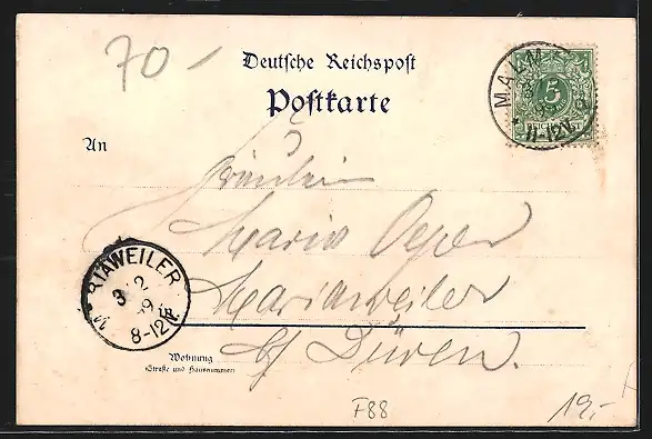 Personenbezogene Daten auf der Rückseite der Karte wurden durch blauen Textmarker unkenntlich gemacht. Die blauen Stellen sind auf die Vorderseite durchgeweicht und wirken sich negativ auf das Postkartenfoto aus