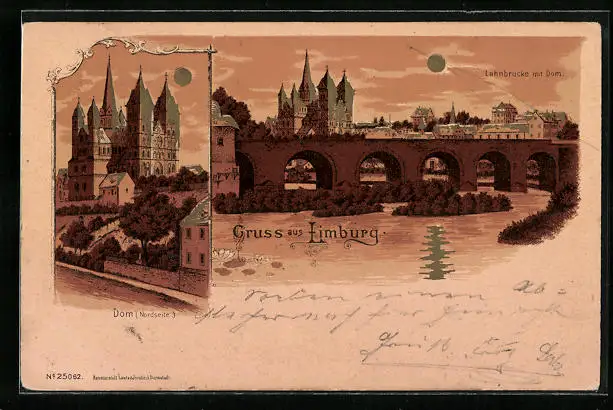 Lithographie Limburg, Lahnbrücke mit Dom im Sonnenschein