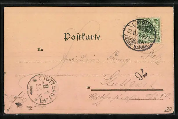 Personenbezogene Daten auf der Rückseite der Karte wurden durch blauen Textmarker unkenntlich gemacht. Die blauen Stellen sind auf die Vorderseite durchgeweicht und wirken sich negativ auf das Postkartenfoto aus
