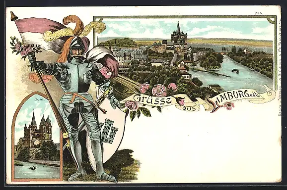 Lithographie Limburg a. d. L., Dom, Ortsansicht, Ritter mit Fahne