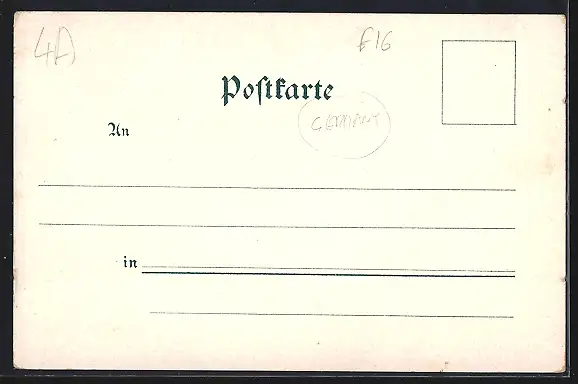 Personenbezogene Daten auf der Rückseite der Karte wurden durch blauen Textmarker unkenntlich gemacht. Die blauen Stellen sind auf die Vorderseite durchgeweicht und wirken sich negativ auf das Postkartenfoto aus