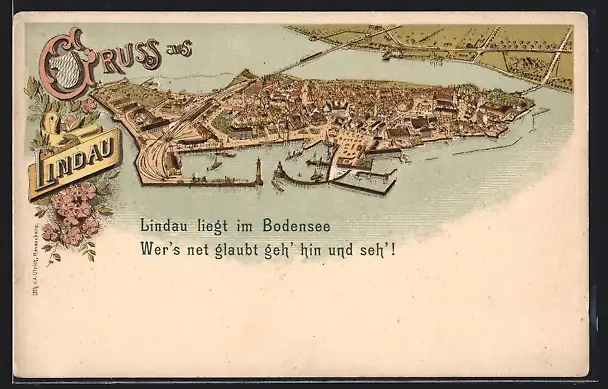 Lithographie Lindau, Blick auf die Insel im Bodensee