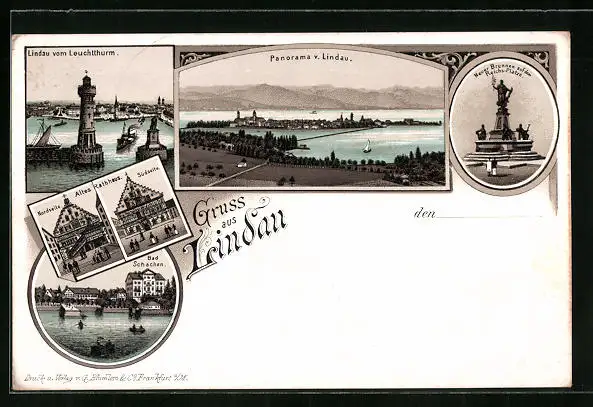 Lithographie Lindau /Bodensee, Altes Rathaus, Leuchtthurm
