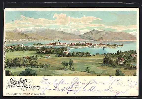 Lithographie Lindau / Bodensee, Panoramablick auf die Insel