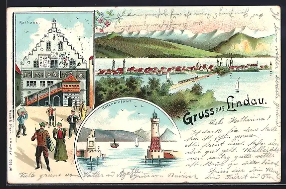 Lithographie Lindau / Bodensee, Rathaus, Hafeneinfahrt, Ortsansicht