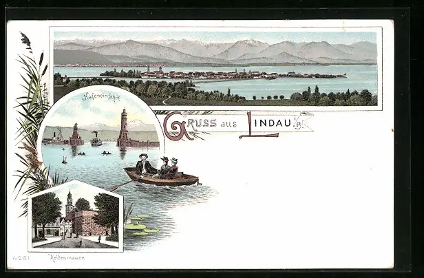 Lithographie Lindau, Gesamtansicht, Heidenmauer, Hafen