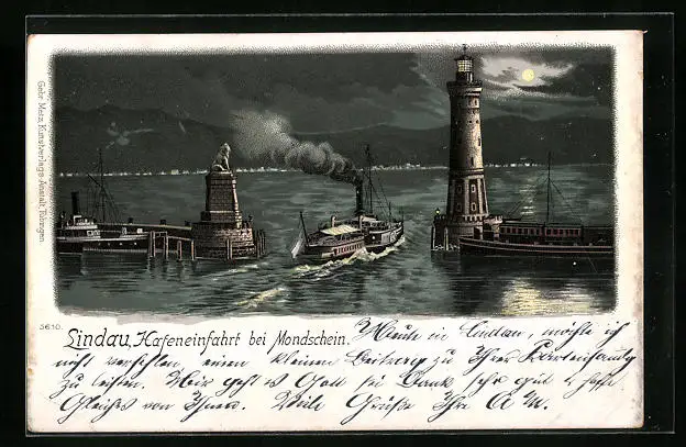 Lithographie Lindau, Hafeneinfahrt mit Leuchtturm und Dampfer bei Mondschein
