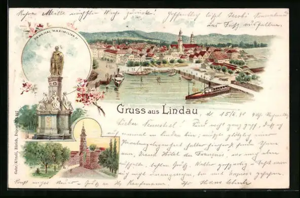 Lithographie Lindau, Ortsansicht und Denkmal Maximilian II