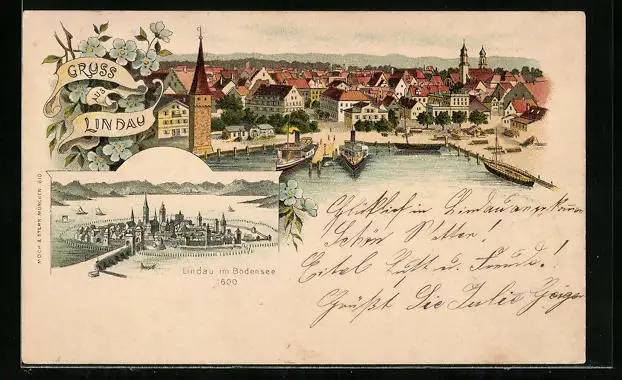 Lithographie Lindau i. B., Dampfer im Hafen