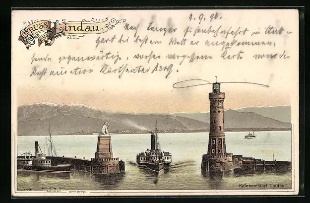 Lithographie Lindau i. B., Hafeneinfahrt mit Leuchtturm