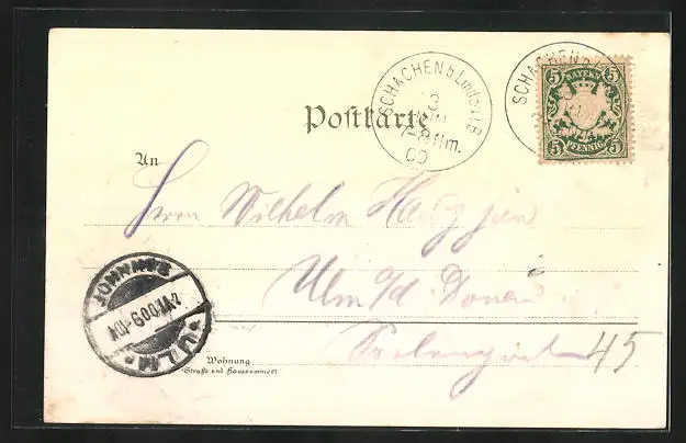 Personenbezogene Daten auf der Rückseite der Karte wurden durch blauen Textmarker unkenntlich gemacht. Die blauen Stellen sind auf die Vorderseite durchgeweicht und wirken sich negativ auf das Postkartenfoto aus