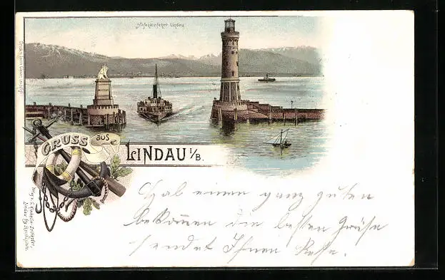 Lithographie Lindau i. B., Hafeneinfahrt mit Leuchtturm und Dampfer