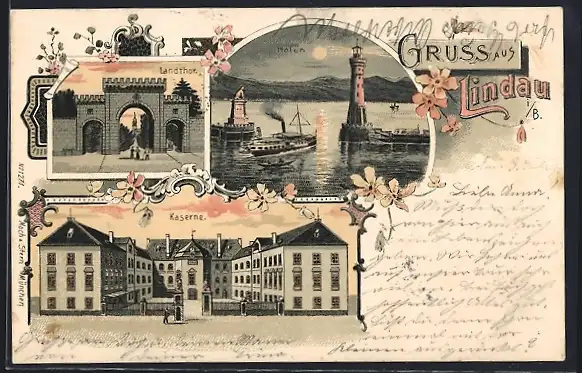 Lithographie Lindau i. B., Kaserne, Landthor und Hafen