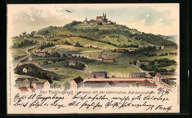 Lithographie Linz, Der Pöstlingberg mit der elektrischen Adhäsionsbahn