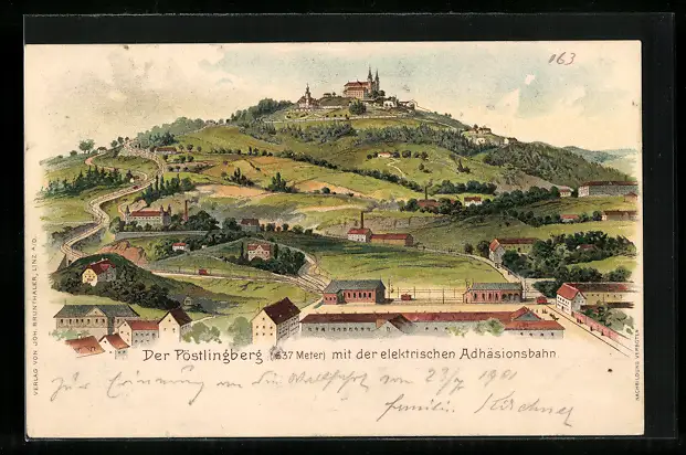 Lithographie Linz / Donau, Pöstlingberg mit elektrischer Adhäsionsbahn