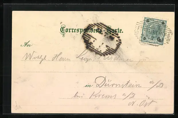 Personenbezogene Daten auf der Rückseite der Karte wurden durch blauen Textmarker unkenntlich gemacht. Die blauen Stellen sind auf die Vorderseite durchgeweicht und wirken sich negativ auf das Postkartenfoto aus