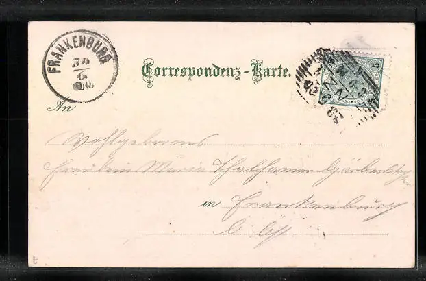 Personenbezogene Daten auf der Rückseite der Karte wurden durch blauen Textmarker unkenntlich gemacht. Die blauen Stellen sind auf die Vorderseite durchgeweicht und wirken sich negativ auf das Postkartenfoto aus