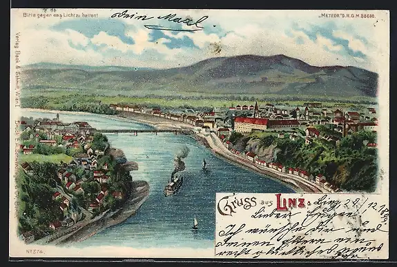 Lithographie Linz, Panorama mit und Brücke, Halt gegen das Licht