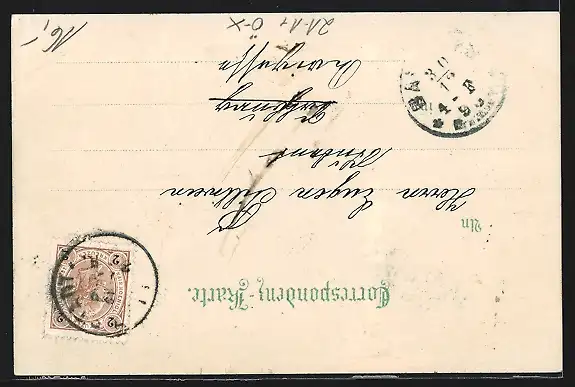 Personenbezogene Daten auf der Rückseite der Karte wurden durch blauen Textmarker unkenntlich gemacht. Die blauen Stellen sind auf die Vorderseite durchgeweicht und wirken sich negativ auf das Postkartenfoto aus