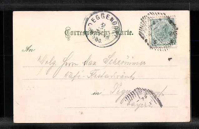 Personenbezogene Daten auf der Rückseite der Karte wurden durch blauen Textmarker unkenntlich gemacht. Die blauen Stellen sind auf die Vorderseite durchgeweicht und wirken sich negativ auf das Postkartenfoto aus
