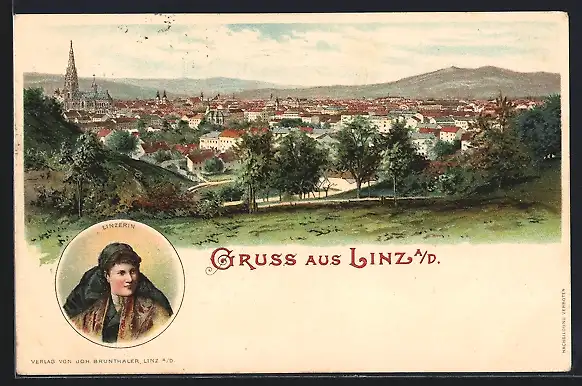 Lithographie Linz a. D., Ortsansicht mit Kirche