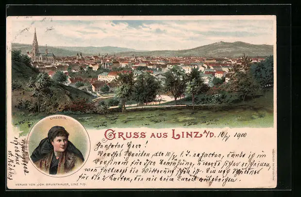 Lithographie Linz a. D., Ortspartie mit Kirche und Landschaft