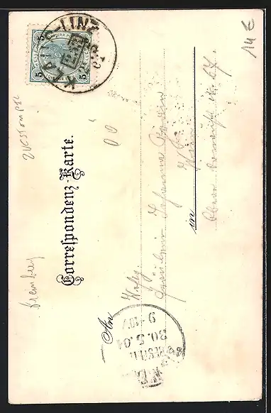 Personenbezogene Daten auf der Rückseite der Karte wurden durch blauen Textmarker unkenntlich gemacht. Die blauen Stellen sind auf die Vorderseite durchgeweicht und wirken sich negativ auf das Postkartenfoto aus