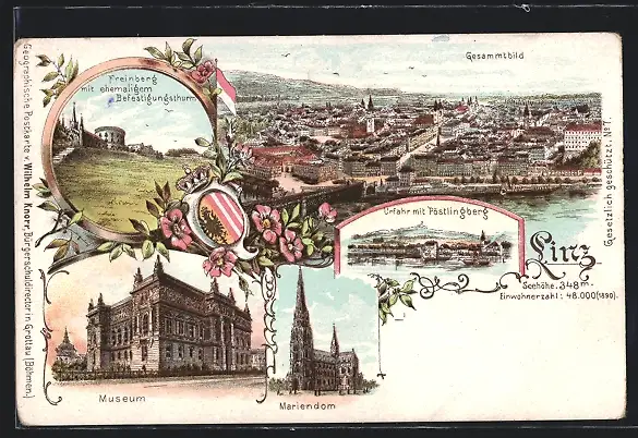 Lithographie Linz a. D., Totalansicht, Urfahr mit Pöstlingberg, Strassenpartie mit Museum