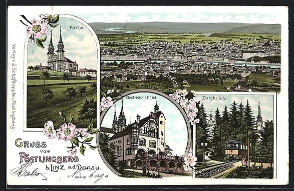 Lithographie Linz a. d. Donau, Electricitäts-Hotel, Durchstich, Kirche, Ortsansicht