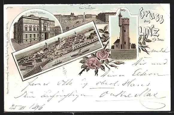 Lithographie Linz a / d. Donau, Franz Josefs Platz, Museum Franzisca Carolineum, Franz Josefs Warte