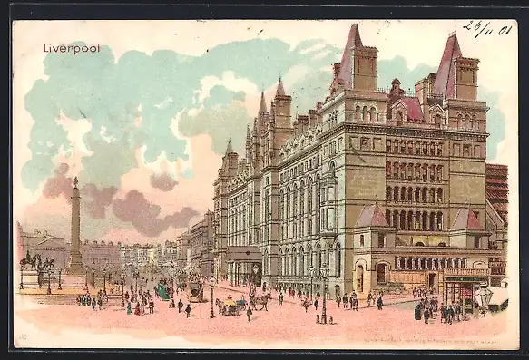 Lithographie Liverpool, Stadtplatz mit Passanten