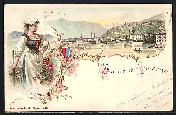 Lithographie Locarno, Stadtansicht vom See her, Tessinerin in Tracht