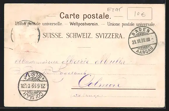 gelaufen 1899, Eckknick li. unten, Einriss re. mittig, Stempelspur, guter Zustand