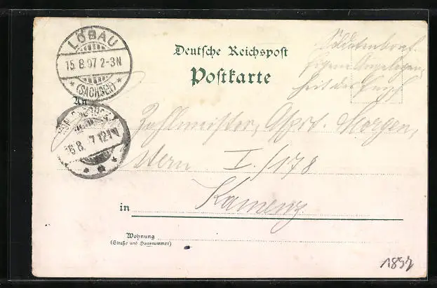 gelaufen 1897, Briefmarke entfernt, Eckknick re. oben, guter Zustand