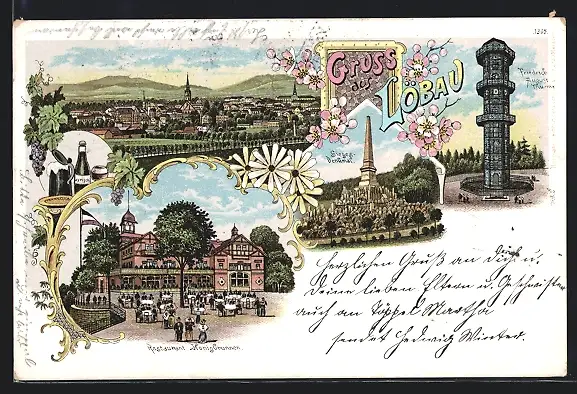 Lithographie Löbau, Ortsansicht mit Kirche und Restaurant Honigbrunnen