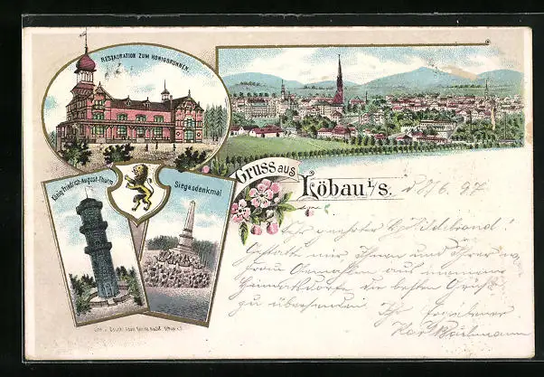 Lithographie Löbau, Restaurant Honigbrunnen, Siegesdenkmal, Panorama