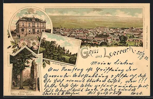 Lithographie Lörrach, Schloss Rötteln, Gr. Bezirksamt, Totalansicht