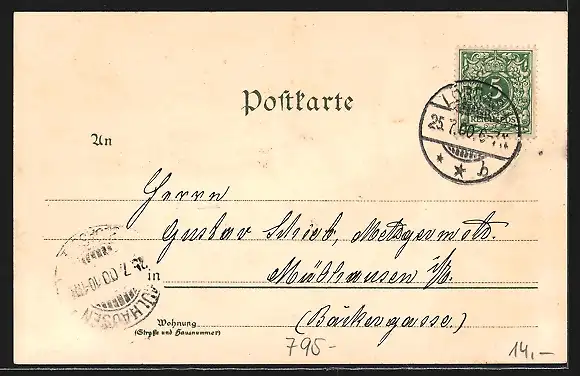 Personenbezogene Daten auf der Rückseite der Karte wurden durch blauen Textmarker unkenntlich gemacht. Die blauen Stellen sind auf die Vorderseite durchgeweicht und wirken sich negativ auf das Postkartenfoto aus